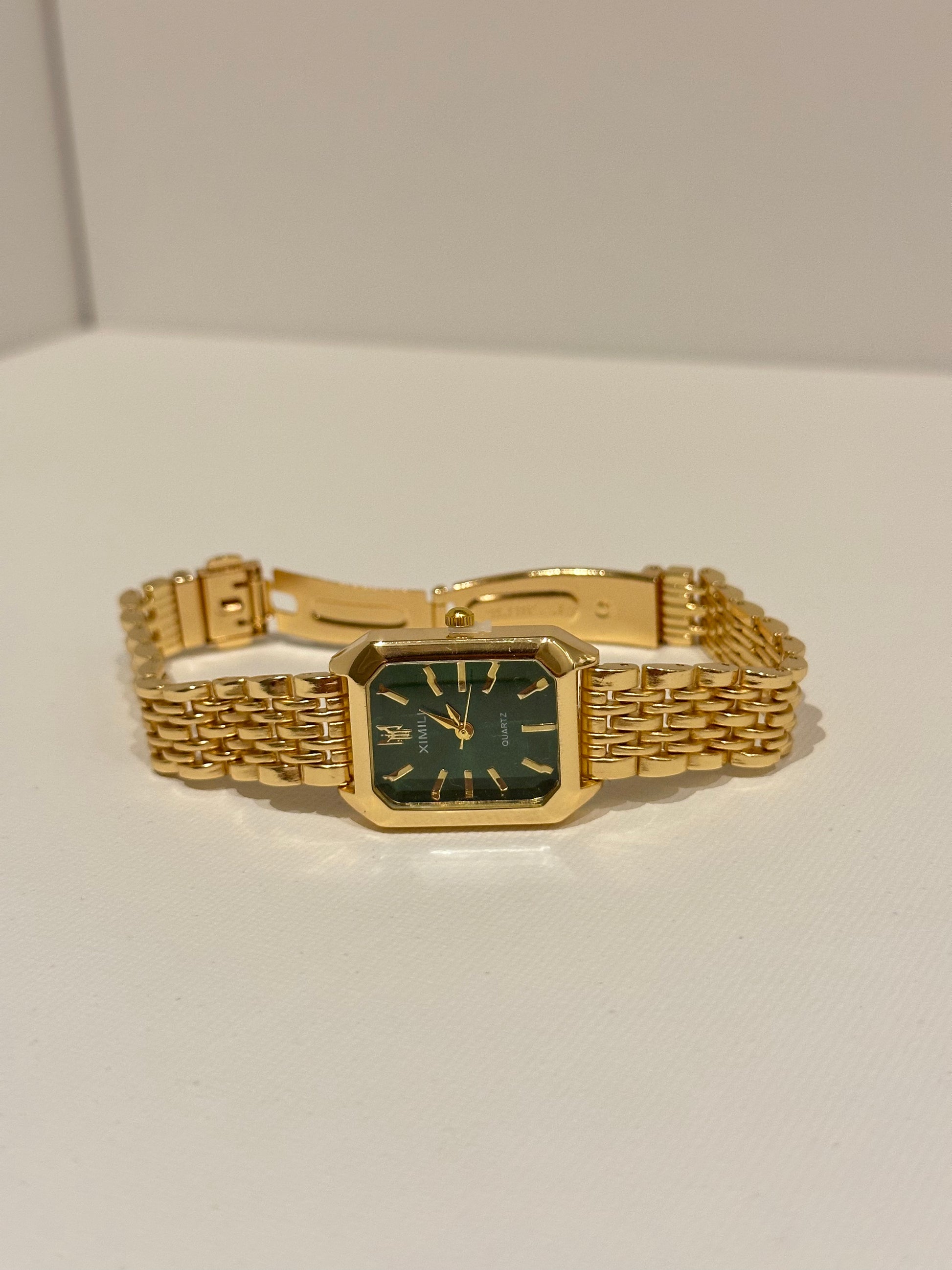 Een luxe horloge met een diepe groene wijzerplaat en een elegante goudvergulde afwerking. Het tijdloze design maakt dit model geschikt voor zowel dagelijks gebruik als speciale gelegenheden. De band is verstelbaar en kan eenvoudig worden aangepast.